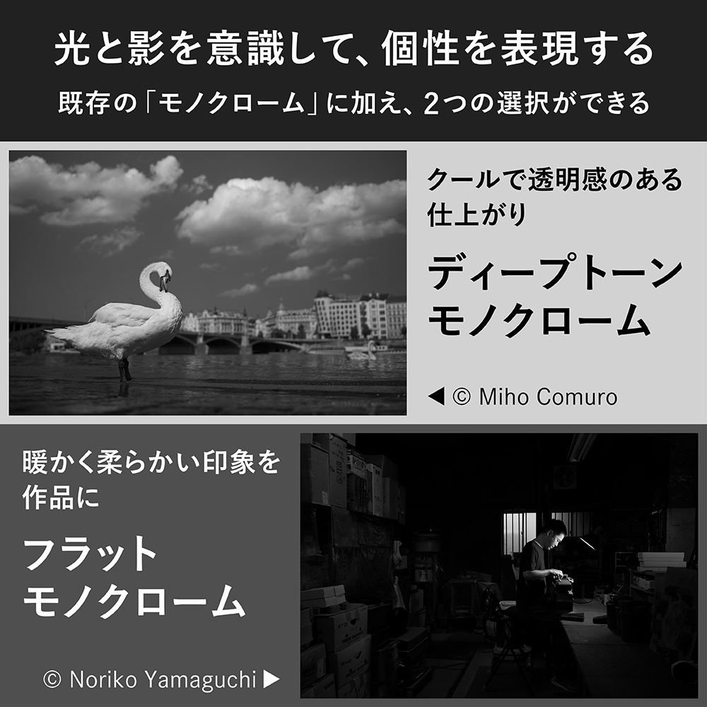 モノクロームは単に白と黒の世界ではありません。光と影の純粋な質感で表現し、形と奥行きというシンプルなグラフィック要素で構成される世界。情報が少ないからこそ、これまでにない視点が生まれ、表現の可能性が拡がります。