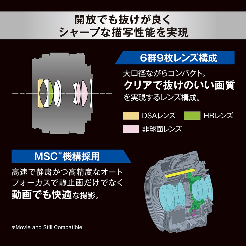 ・レンズ構成:6群9枚(DSAレンズ1枚、HRレンズ1枚、非球面レンズ2枚)
