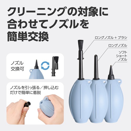 メンテナンス対象や場所に合わせ、ノズルを簡単に交換できます。広範囲の清掃にはブラシの装着も可能なロングノズル、精密な細部には傷つけにくいシリコン製ショートノズルが活躍。様々な機材のクリーニングがカバーできます。