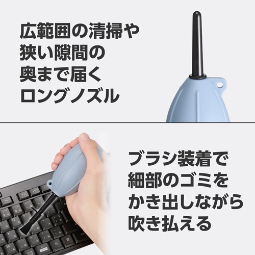 先端までソフトなシリコン素材のショートノズルは、清掃中に機材と接触しても傷をつけにくく、大切なカメラやOA機器にも安心して使用できます。ブロアーの先端を細かくコントロールできるので、カメラボディの溝、レンズマウントの接点、PCキーボードの隙間など、細部のホコリやゴミを的確に吹き飛ばします。