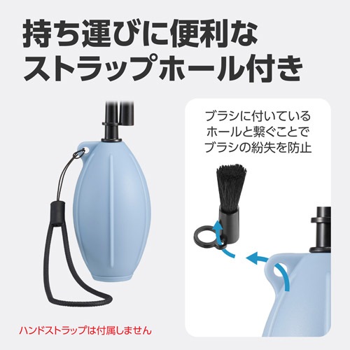 本体のノズル付け根と着脱式ブラシに、それぞれ持ち運びに便利なストラップホールを設けています。ブラシと本体を紐などで繋げば紛失防止に、本体にハンドストラップなどを取り付ければ携帯性が向上します。※画像のハンドストラップは付属していません。