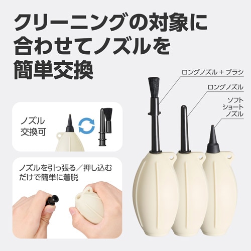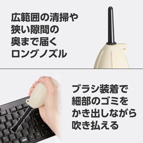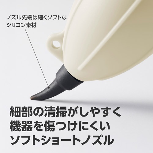 先端までソフトなシリコン素材のショートノズルは、清掃中に機材と接触しても傷をつけにくく、大切なカメラやOA機器にも安心して使用できます。ブロアーの先端を細かくコントロールできるので、カメラボディの溝、レンズマウントの接点、PCキーボードの隙間など、細部のホコリやゴミを的確に吹き飛ばします。