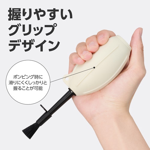 手のひらにフィットして握りやすいグリップデザインです。表面に施した立体ラインがポンピング時の滑りを防ぎ、狙った場所にしっかりと風を送ることができます。素材には、経年劣化に強く耐久性に優れたシリコンゴムを採用。気になるゴム臭さがほとんどなく、気持ちよくメンテナンス作業を行えます。